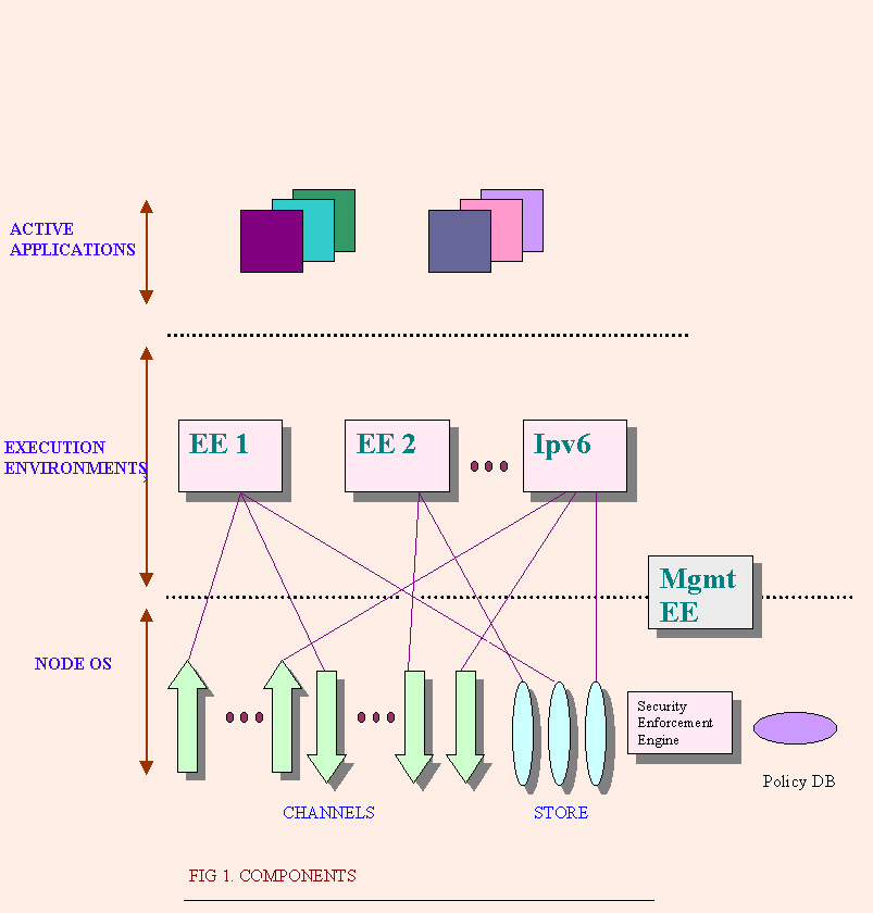The functionality of the active network node is divided among the Node Operating System (NodeOS), the Execution Environments (EEs), and the Active Applications (AAs). Each EE exports a programming interface or virtual machine that can be programmed or controlled by directing packets to it. Thus, an EE acts like the ``shell'' program in a generalpurpose computing system, providing an interface through which endtoend network services can be accessed. The architecture allows for multiple EEs to be present on a single active node. However, development and deployment of an EE is considered a nontrivial exercise, and it is expected that the number of different EEs supported at any one time will be small.[4]